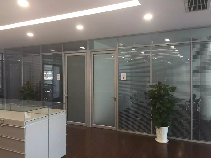 寶豐集團(tuán)總部項(xiàng)目采用:HX-85款氧化銀色雙玻內(nèi)置百葉隔斷,隔斷配套單玻璃有框門(mén)扇。