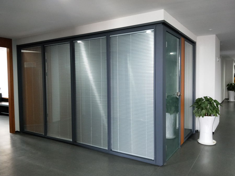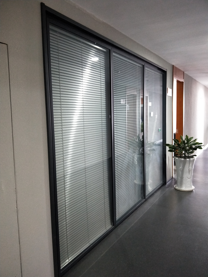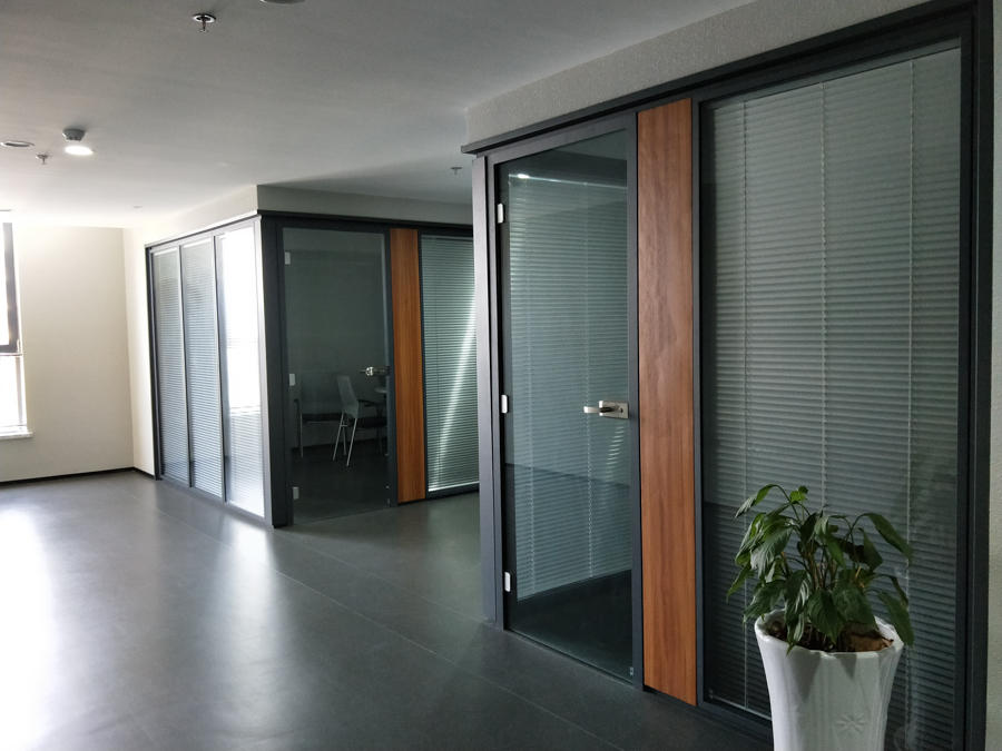 青島城投金融控股集團(tuán)項(xiàng)目:HX-85款靜電噴涂灰色,雙層6mm鋼化玻璃內(nèi)置百葉隔斷,隔斷配套實(shí)木復(fù)合門扇。電梯廳自動門系統(tǒng)采用松下自動門及門禁系統(tǒng)。