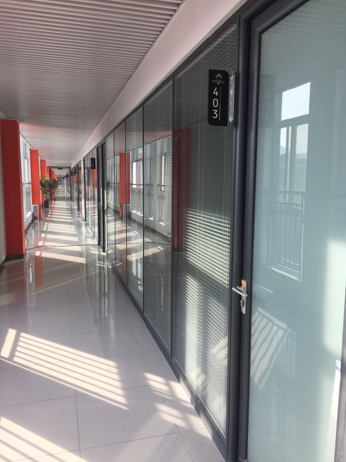 寶豐集團(tuán)總部項(xiàng)目采用:HX-85款氧化銀色雙玻內(nèi)置百葉隔斷,隔斷配套單玻璃有框門(mén)扇。